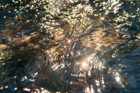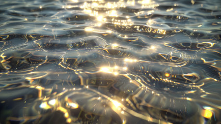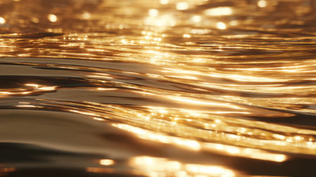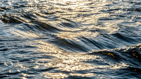Shimmering surface of water reflects golden hues, creating mesmerizing pattern of light and movement. tranquil waves evoke sense of calm and beauty in nature