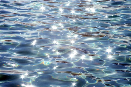 This image shows a close-up view of rippling water, with sunlight reflecting off the surface and creating a shimmering effect. The water is a deep blue-green color, and the sunlight creates a warm, inviting glow.