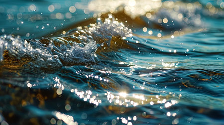 Close-up view of ocean waves shimmering with sunlight. Bokeh effect adds depth, enhancing the natural beauty and serene quality of the vast ocean landscape.