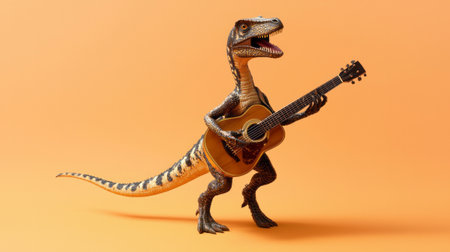 Oviraptor dinosaur is happy playing the guitar, isolated on a light orange background.