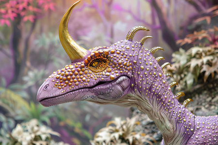 An image of a dinosaur with golden beak and horn