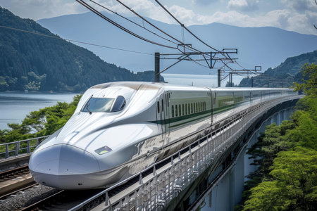 Modern bullet train travels over a bridge with picturesque mountain and lake views