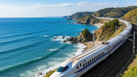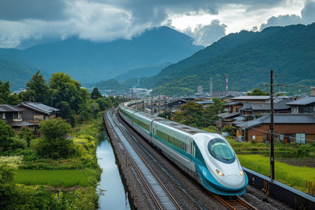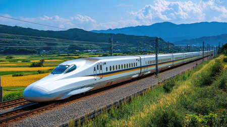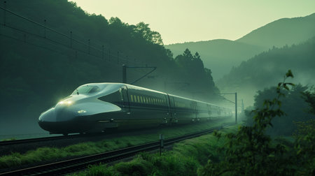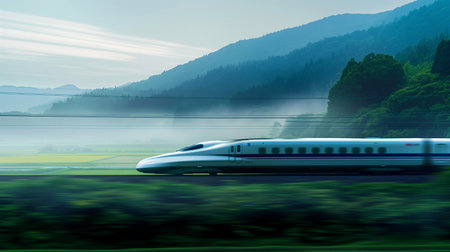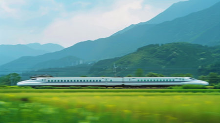 A high-speed train glides through lush green mountains, capturing the essence of modern travel amidst serene natural beauty and vibrant landscapes.