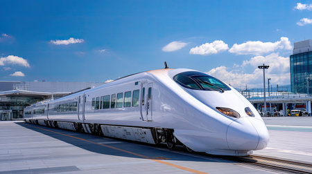A sleek, white high-speed train is positioned at a modern railway station, ready for travelers. The bright blue sky and dynamic clouds create an inviting atmosphere.