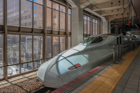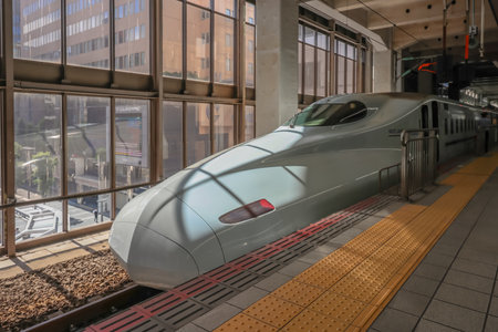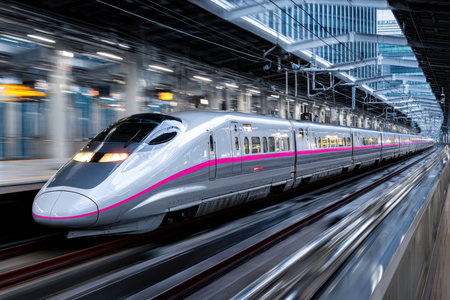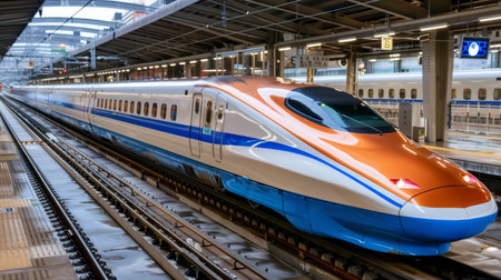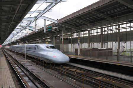 Japanese high speed shinkansen bullet train arriving at contemporary railway station