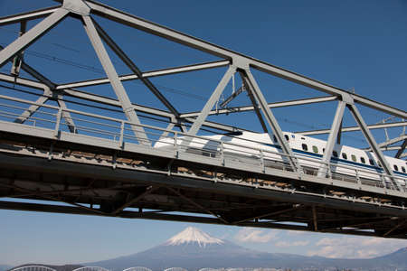 Shinkansen bullet train speeding through the Japanese countryside with Mount Fuji in the background