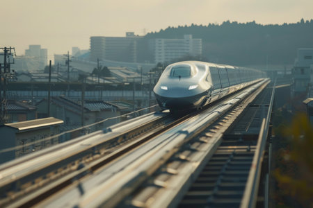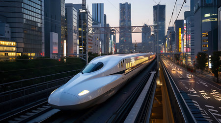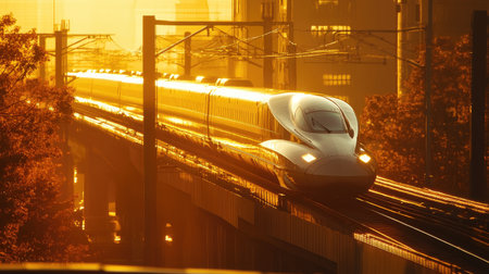 A sleek high-speed train glides through a cityscape, bathed in the warm glow of a golden sunset. This image captures the essence of modern travel and urban energy.