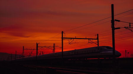 Silhouette of a high-speed train against a fiery sunset sky, symbolizing progress and connectivity.