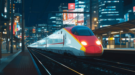 A high-speed train stands illuminated at night in a bustling city, showcasing modern architecture and vibrant lights in an urban setting.