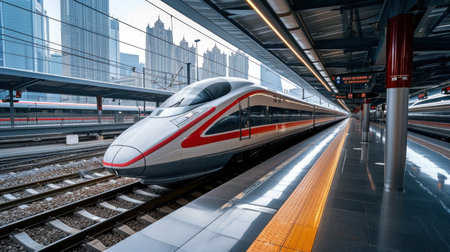 Modern high speed train standing at a station platform, symbolizing efficient transport technology