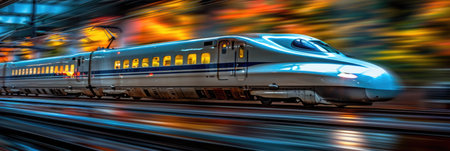 A sleek train swiftly passes through a vibrant autumn landscape, showcasing a blend of warm colors in nature. The scene captures motion and tranquility in travel.