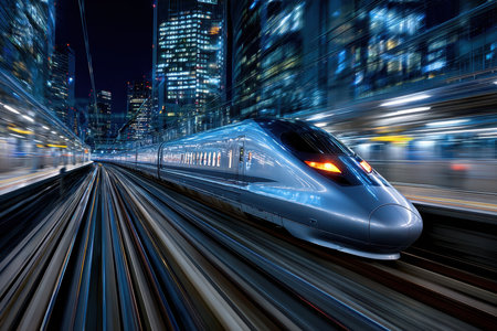 A high-speed train races through an urban landscape at night, showcasing the dynamic motion and vibrant city lights in a captivating scene.