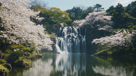 This stunning image captures a majestic waterfall flowing gently amidst blooming cherry blossom trees. The tranquil landscape reflects the beauty of nature in spring.