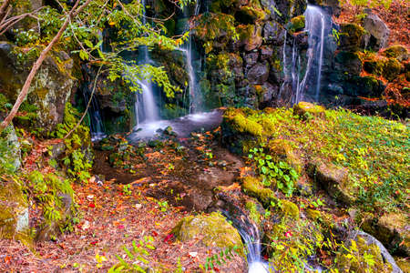 Japanese Travel Concepts. Scenery of Tranquil Multiple Waterfalls At Kawaguchiko Lake in Japan At Fall Season. Horizontal Shot