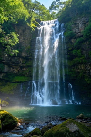 Majestic waterfall cascading down rocky cliffs surrounded by lush green forest, creating a serene and natural landscape full of movement and freshness.