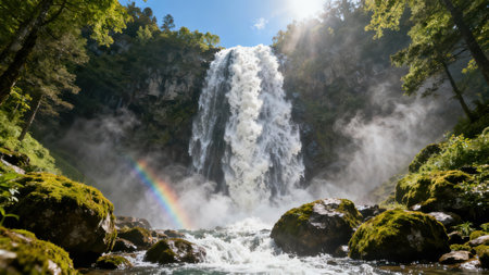 Majestic natural landscape featuring a soaring cascade framed by dense evergreen trees and sun-drenched cliffs, illuminated by a brilliant sun flare and spectrum reflection over dark moss-covered...