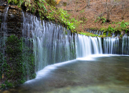 Beautiful scenery of Shiraito Waterfall in Karuizawa, Japan. The site is most beautiful in the fall, when the leaves change color creating a heavenly scene.