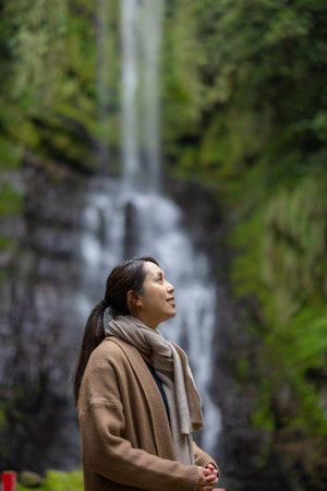 Woman go Wufengqi Waterfall in Yilan of Taiwan