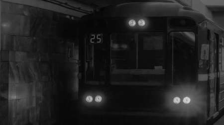 black and white photo. Moving underground train. The arrival of the subway train at the station. City without traffic jams. The concept of public transport.