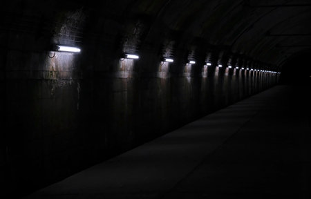 Dark underground corridor barely illuminated by fluorescent tubes