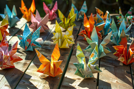 A vibrant set of origami cranes on a wooden surface highlights artistic craftsmanship.