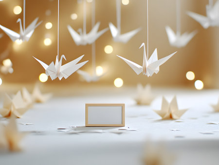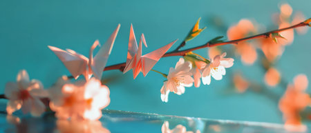 Delicate pink cherry blossoms paired with origami cranes in a serene flat lay arrangement