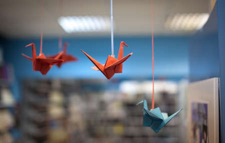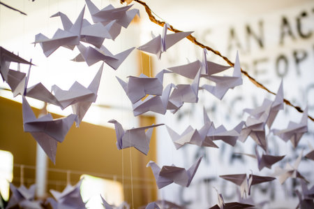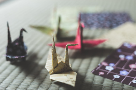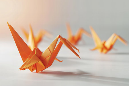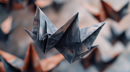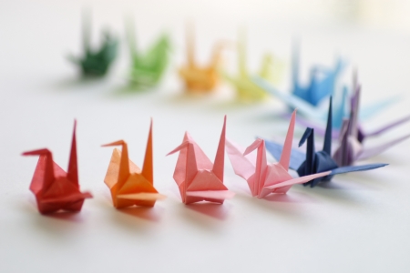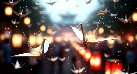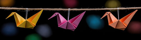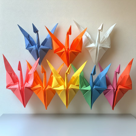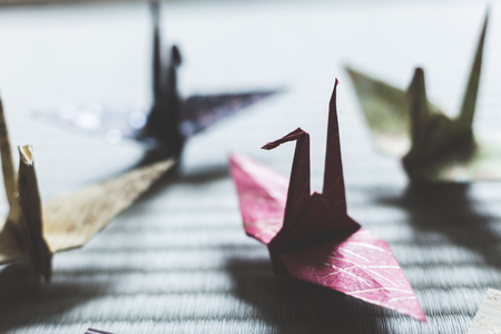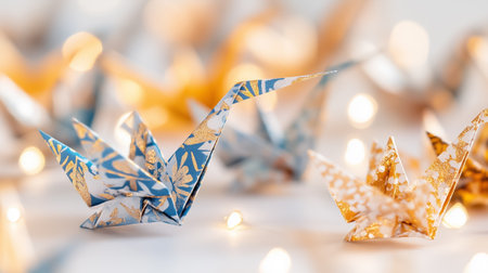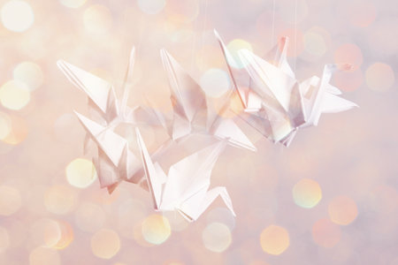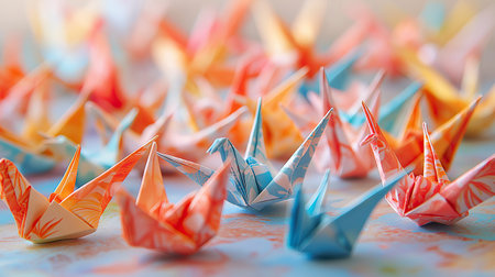 Intricate paper cranes showcase vibrant colors against a softly blurred background