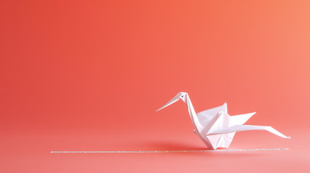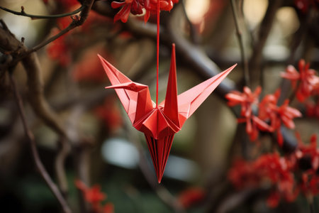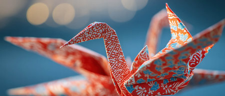 A beautifully crafted origami crane, folded from paper with a vibrant floral pattern. Bathed in soft, natural light, the delicate paper bird stands as a symbol of peace, hope, and meticulous artistry.