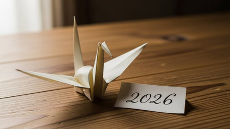 Elegant image of a white origami crane with a '2026' card on a wooden surface. Ideal for New Year's greetings, future planning, travel promotions, or concepts of hope and peace. Use for websites, social media, or advertising.