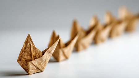 This artistic image captures delicate origami boats made from natural materials, beautifully arranged in a line, showcasing creativity and eco-friendly craftsmanship in design.