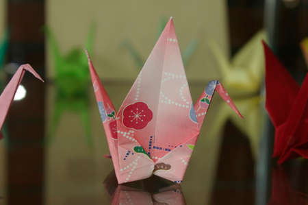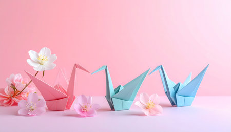 Paper cranes in pink and blue shades create a peaceful scene on a gentle surface, showingcasing intricate designs.
