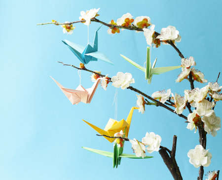 colorful paper origami birds on flowering branches of cherry (sakura)