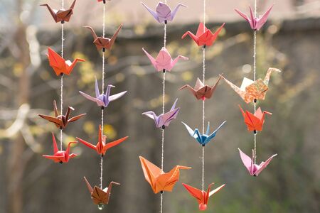The concept of the beautiful scenery on holiday - the traditional Japanese origami on strings in the background graphics and pink of sakura blossoms. Many swans made out of paper. Soft focus.