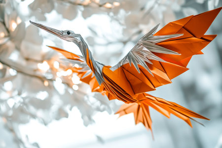 Elegant origami crane in orange and silver hangs gracefully under soft white lighting