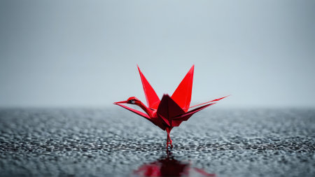 Tiny water bead balancing on red origami crane minimalist Japanese art elegant simplicity contemplative composition
