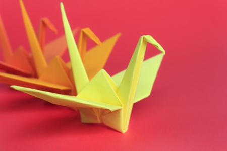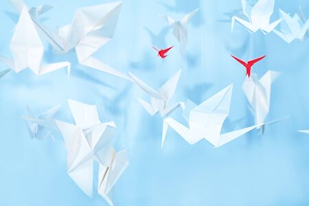 soft focus handicraft origami paper bird flock red and white color in the sky with blurred background they are a symbol of hope and healing during challenging times in Japanese called Senbazuru