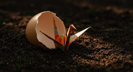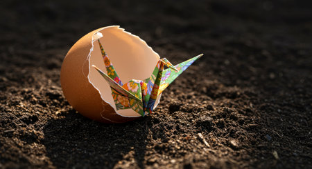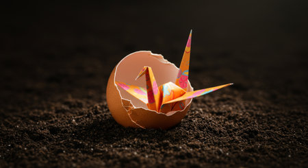 A cracked eggshell reveals a colorful origami bird, symbolizing transformation and potential, grounded by rich soil beneath, embodying the nurturing environment supporting new begi
