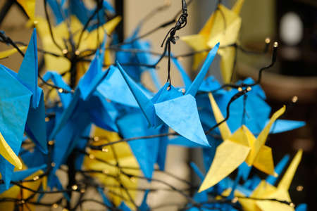 Japanese origami birds of peace blue and yellow concept of peace and help in the war. Concept of the Independence Day of Ukraine. selective focus.