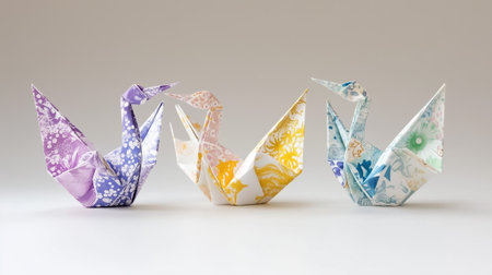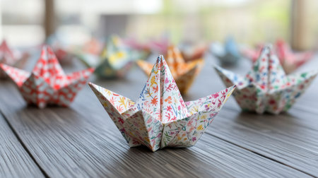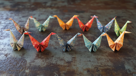Delicate origami cranes in vibrant patterns are arranged beautifully for creative inspiration.