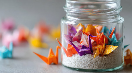 A collection of vibrant origami cranes beautifully arranged inside a glass jar filled with sand, creating a serene and artistic display on a white surface.