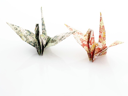 Two beautifully crafted origami cranes in floral patterns exhibit artistic skill and creativity on a pastel backdrop.