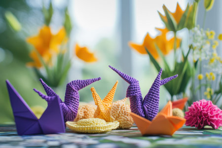 Brightly colored origami cranes and flowers create a joyful atmosphere in a sunny room, enhancing creativity.
