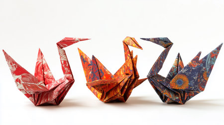 Three vibrant origami cranes folded from patterned paper highlight detailed artistry and craftsmanship.