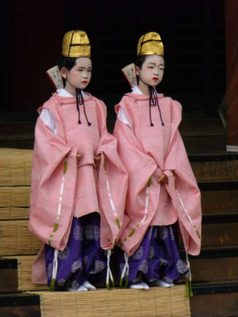 Kyoto, Japan, July 13, 2016: Portrait view of two Japanese children dressed in traditional kimono in a Kyoto temple