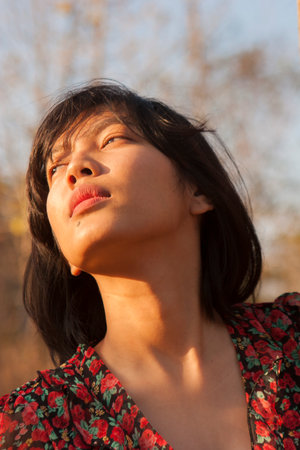 Asian cute girl teen innocent shy smiling happiness moment with nature sunshine beautiful background
