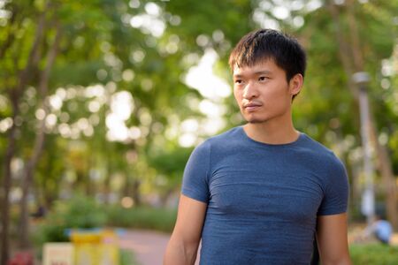 Displaying adult Asian male featuring left facial half in park, with blurred foliage, copy space. Portrait, nature, serenity, mindfulness, natural light, outdoors, close-up