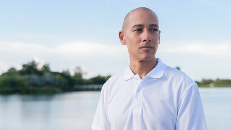 Stylish bald man wearing a white polo shirt standing by a calm lake. Confident and relaxed expression in a natural light outdoor portrait with peaceful waterfront scenery.