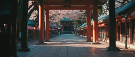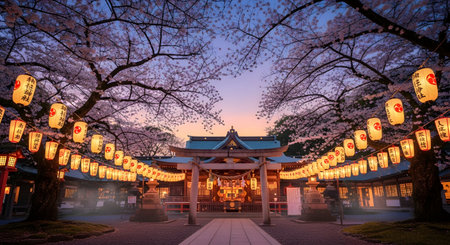 Cherry blossoms create a serene pathway leading to a tranquil temple