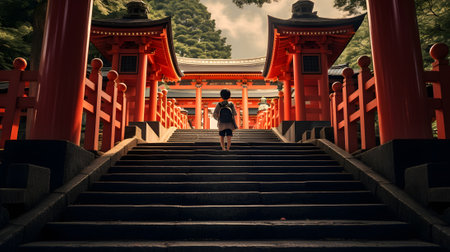 Young man walking up the stairs to the red torii gate in Kyoto, Japan
