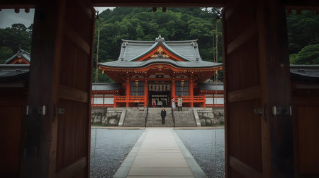 An Minimalist Serenity: Traditional Japanese Wooden Shinto Shrine in a Serene Setting